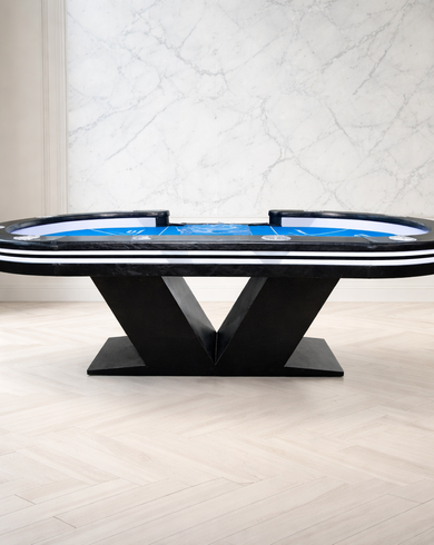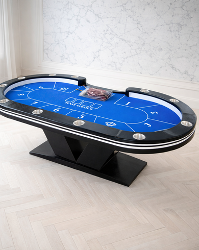 Стол рассчитан на комфортную игру до 10 человек. Конструкция выполнена с устойчивыми V-образными ножками, которые придают столу выразительный внешний вид и обеспечивают надежную опору. Рабочая зона продумана для удобного размещения карт, аксессуаров и игровых элементов, а встроенная подсветка делает стол особенно эффектным в интерьере покерного клуба или игровой комнаты.