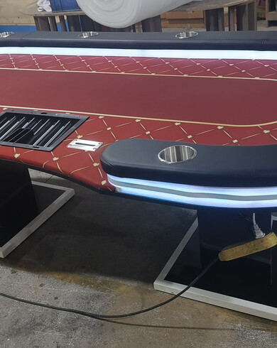 Стол проектируется под конкретные задачи заказчика: можно изменить размеры, цвет сукна, конфигурацию подсветки, количество подстаканников, форму трей-лотка и другие элементы. Мы не продаём готовые столы со склада, а изготавливаем покерные столы под заказ с учетом пожеланий по дизайну, комплектации и стилю помещения.