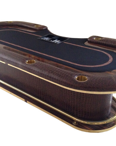 Стол рассчитан на 10 игроков, при необходимости возможно изготовление конфигурации на 9 игроков. В данной версии подсветка отсутствует — акцент сделан на благородную фактуру материалов, глубокие оттенки, премиальную отделку и респектабельный внешний вид. Основание, геометрия, отделка игрового поля, конфигурация подстаканников и декоративные элементы подбираются индивидуально под проект заказчика.