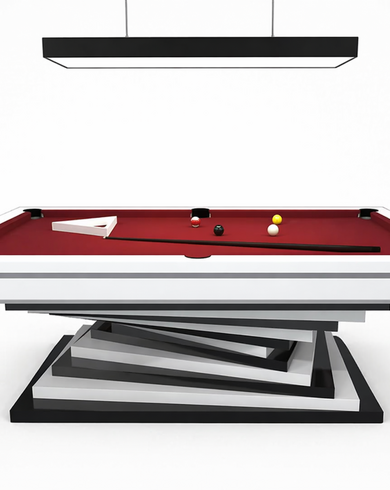 Современный бильярдный стол в чёрно-белом дизайне с красным сукном — это выбор для тех, кто ценит нестандартные решения, визуальную выразительность и качественное исполнение.