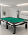 На изображении представлен стол для бильярда с зелёным игровым полем, контрастной чёрно-белой отделкой корпуса и сдержанным современным дизайном. Минималистичный интерьер подчеркивает форму изделия, делает акцент на игровом поле и помогает гармонично вписать бильярдный стол в светлое пространство без визуальной перегрузки.